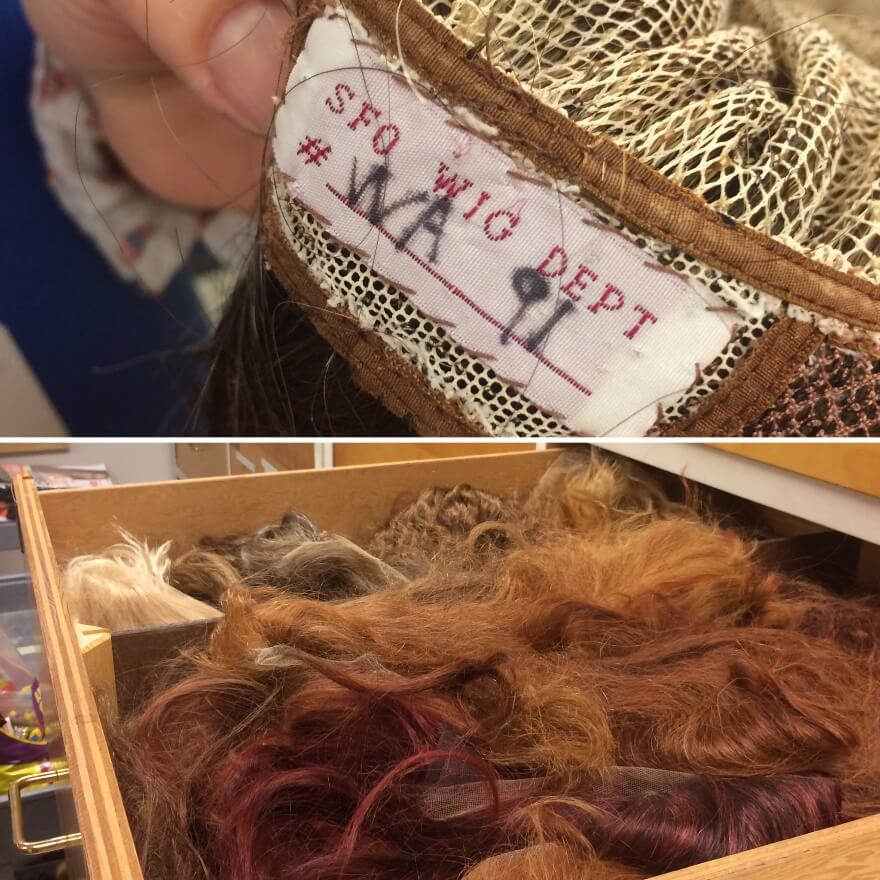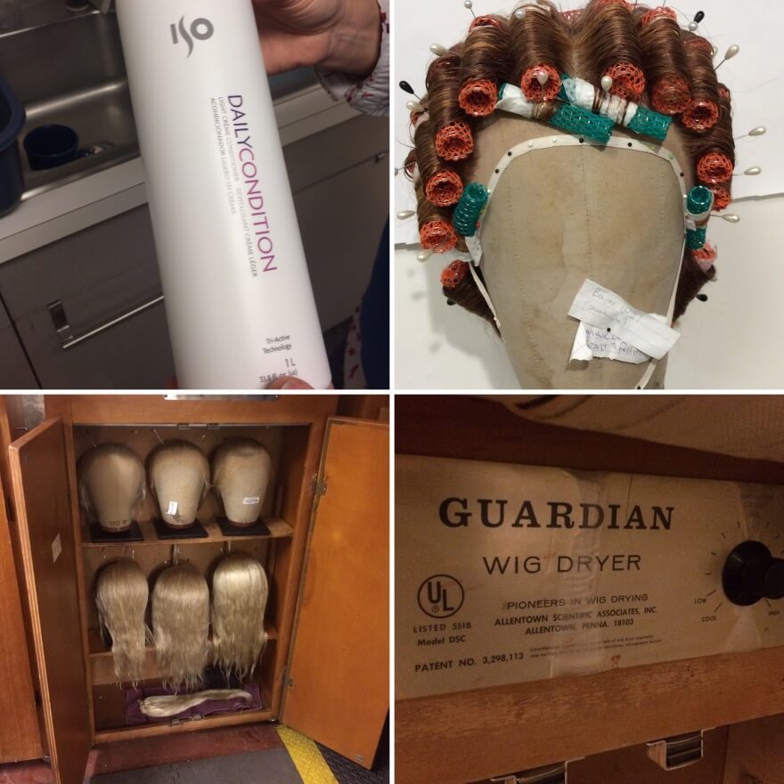 When cared for, wigs are long lasting items that have a shelf life of 30–40 years. They are repurposed and refashioned from show to show and person to person. The wig-shop has drawers of wigs labeled by such fantastic codes as WNW (women’s natural wavy) or WSDW (women’s short dark wavy). Unlike costumes which tend to be show specific and have labels for each singer who wears them, wigs just have numeric labels. The wig shop keeps a database of the history of each wig and uses that to match singers to their hairpieces!