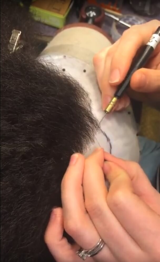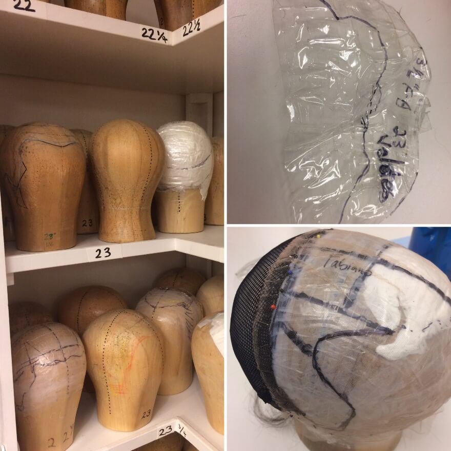 Building a wig from scratch first requires you to create a replica of the artists’ head. I wish I could share a video with you of this, but cellophane and tape are used to create a mold of the artist’s head, with black sharpies noting the finer details. This cellphone ‘pate’ is then placed over wood-block heads and padding is used to build out the artists exact head shape to create the base shape for the wig. (Our wood-block heads come from Germany and are now 60 years old and no longer made).