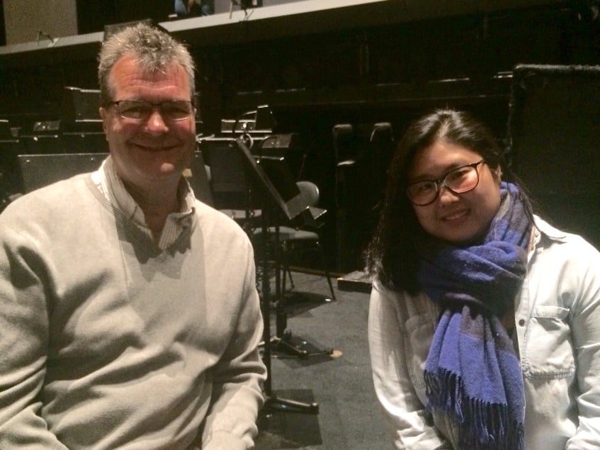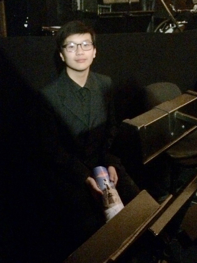 Trumpet player of the Opera Orchestra John Pearson worked alongside Shanzhi Yu from RASOTA. Shanzhi is new to orchestras, and this was the first time playing in such a professional environment. He’s used to being asked to play quieter at school, but here in the beautiful expanse of the Wilsey Center, conductor Ming Luke was asking for more sound, encouraging the students to listen to other sections more and ensure that each entrance was exact.