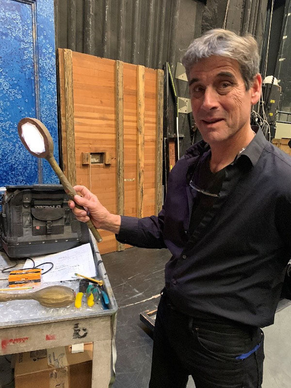 The flame comes from two scrunched up pieces of flash paper – very thin paper coated with nitrocellulose and an oxidizing agent. Flash paper burns very quickly and at great heat – disappearing in a matter of milliseconds. There is no way that it could ever reach the floor while still on fire – the combustion is far too quick. But how to get it to throw a flame? That’s where the two pieces of flash paper come in. Geoff packs both into a small red holder which contains an electronic ‘match’. The match ignites the first piece of paper and that piece of paper ignites the second, propelling it out of the spoon! The spoon is testament to Geoff’s incredible pyrotechnic skills and it made for a magical addition to the witch’s scene!
