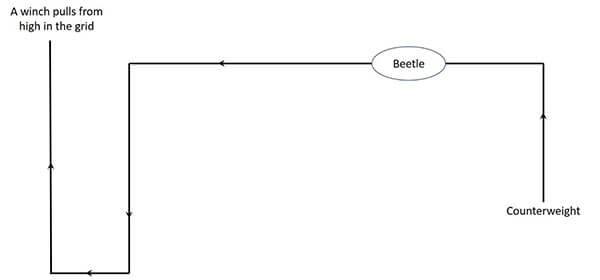 The moth – lit by LED tape that makes it glow – has a relatively simple vertical pulley system. The beetle has a more complex path that goes up one side of the backstage, across the top, and down to a counterweight on the other side. Moving the beetle is not just about tracking it across, but ensuring it can return to its original place, to be reset for the next night. So a counterweight is added to one end of the beetle, allowing it to be moved in both directions! That simple looking false proscenium hides a lot of magic!