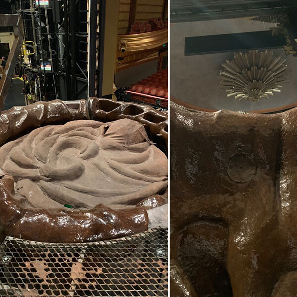 There are two big effects with the chocolate pot: first the sinking of the witch as she descends into the gooey chocolate inside. This is accomplished with a lift built into the pot. The witch is pushed out onto a squishy, foam lid made to look like chocolate and then the lift descends taking the witch and lid down together. Of course, I had to test this out – it gives one of the most unique views of the opera house chandelier that I’ve ever had!