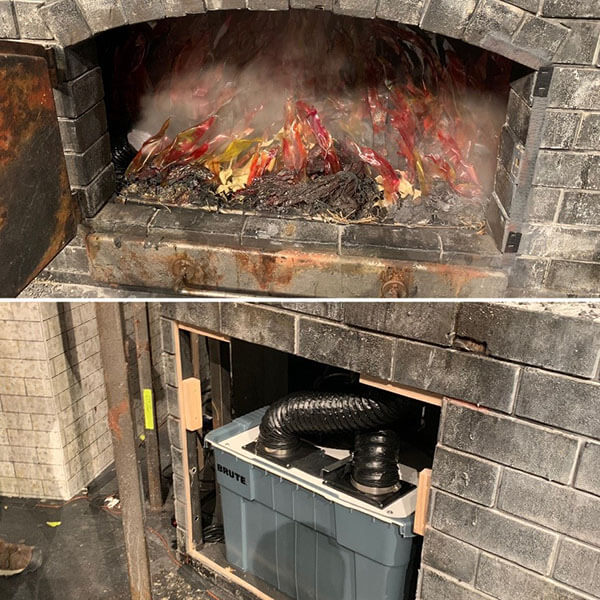 The spoons are made from an aluminum frame, then taped up and painted to look like real wood. The spoons contain two pieces of technology, both controlled by buttons on the handle. The flickering lights come from LEDs built into the bowl of the spoon and operated by a microchip programmed by electrician Paul Puppo on our crew. The flame-throwing aspect comes from another button, but one that requires the flickering LEDs to be activated first. That creates a safety feature called a “dead man switch” – a double activation, further made safe by requiring the flame switch to be pushed twice in succession by the operator (either the witch, Hansel or Gretel). So you depress the LED switch, then activate the firing mechanism then press again to fire!