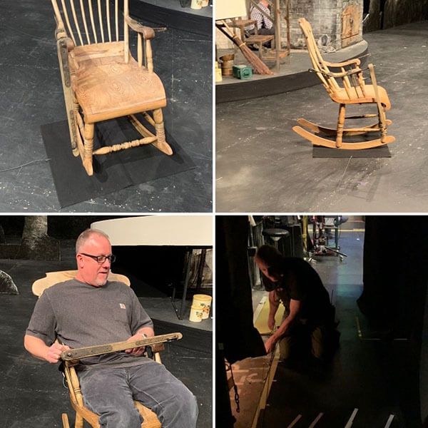 Then, finally, one rather traditional but still very effective piece of magic. The rocking chair – if you recall – magically moves across the stage as the witch traps Hansel. No complicated electronics here – this is some good old-fashioned theatre trickery! A black pad is pre-placed onstage attached to a very thin wire. The pad itself has a spike mark (the colored tape marks onstage that show where things need to be placed), and when Robert Brubaker, the witch, moves the chair onto the floor, he places it onto the pad. Mark Kotschnig on the props crew, is hidden away in the wings and, at the appointed moment, he pulls the wire across the stage, taking the chair with it! And then, once Hansel is in the chair, Sasha Cooke (playing Hansel) cunningly flips over the cross bar using a little metal lever, unseen by the audience, making it look like the chair is automated.
