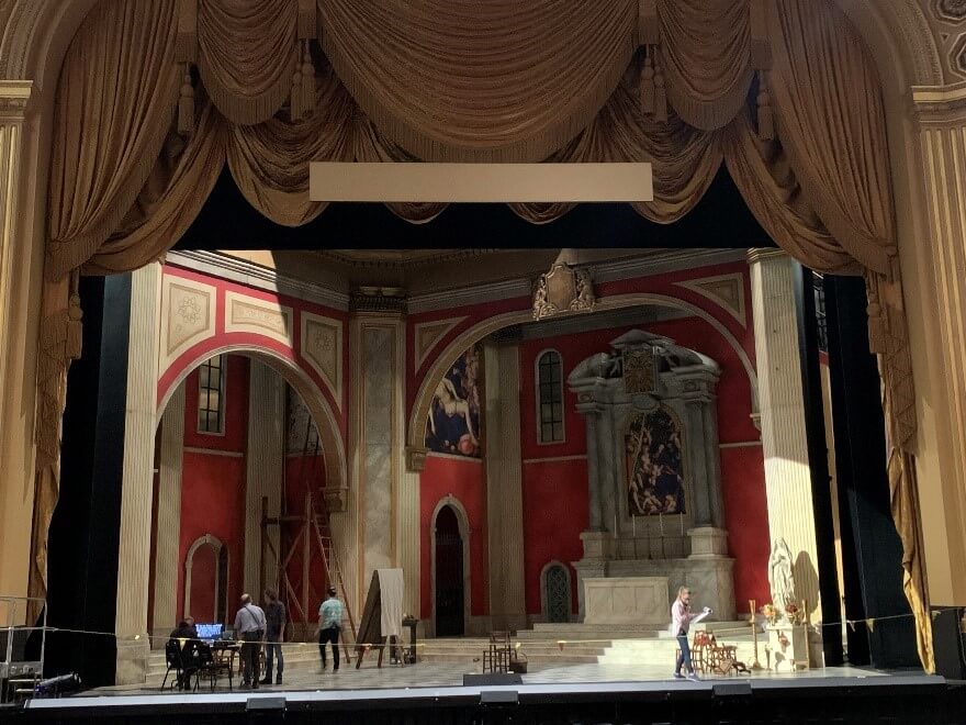 While staging is set in Zellerbach, the stage itself is being readied for opening night. On July 26, we loaded in Tosca—yet another life-affirming moment of return. Now in this case, it wasn’t the first time we’ve had scenery in during the pandemic—as you may recall, we fully tech’d the set of Fidelio last year, after building it in the scene shop. But this was the first time we hung scenery and lights and utilized the full space of the stage, fly-tower, and storage area in the back of the theater. I was reminded on that load-in day of the incredible choreography that goes into the backstage world. Every person has a very specific role to play and they execute it with great precision, ensuring that their piece of the stage is set so that someone else can do what they need to do. We have one of the great stage crews of the world, and to see how immediately all of that collective precision returned was inspiring.