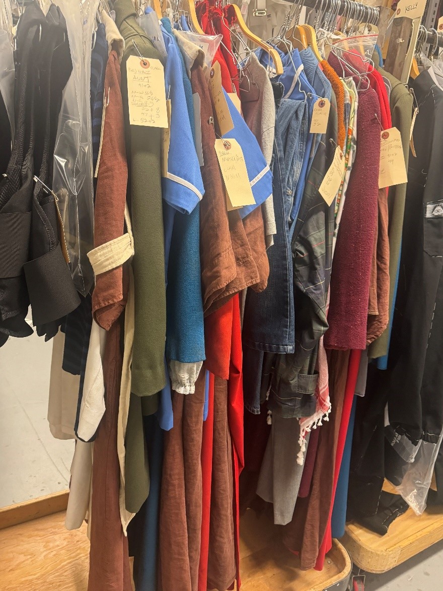 There are also a number of costumes from “the time before”—the pre-story, before Gilead takes over American society in a coup. These are off-the-rack clothes aimed to show the normalcy of society before all of this unfolds. These scenes feature a number of children, and Christina shared a Covid-quirk. The production was originally intended to be produced in Copenhagen and San Francisco in 2020. When it came back to Copenhagen in late 2022, there was a Danish requirement that those people originally cast be offered the job again, including the supers. Those children cast in 2020 had outgrown their costumes and so Christina and the team there had to adapt and adjust.