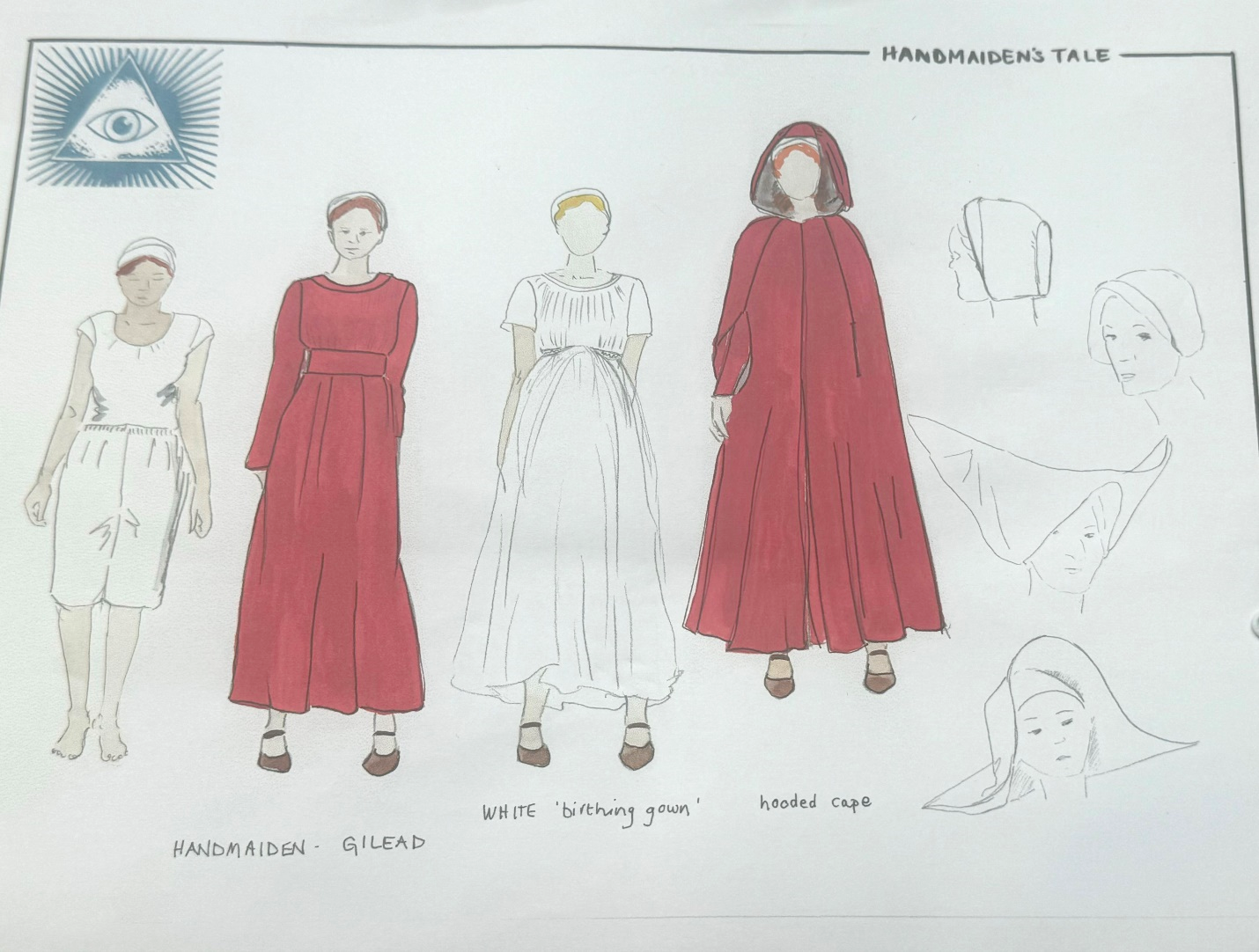 The designs and example of an aunt’s costume, including a close-up of the eye of Gilead pin.