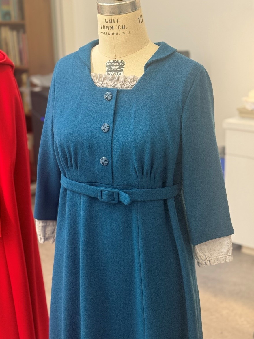 The wives are dressed in a feminine but modest look from the 1950s, again in a slightly muted blue, and a headpiece that they wear when going out to show a little more formality. It’s as much a uniform as the handmaids in that sense.