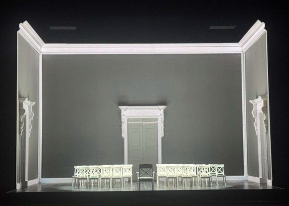 Scouring the Opera Australia stores, she came across a three-sided gauze room, replete with classical doors, that had been designed by Michael Yeargan (our Ring designer) for a production of Massenet’s Werther. Working with Opera Australia’s technical team, she developed a stage framework that could work for both Idomeneo, which she would direct, and The Magic Flute, directed by a different director. The difference would be that Magic Flute would stay completely analogue, while Idomeneo would be completely digital. The scrim walls (a kind of gauze) become projection surfaces, fed by three projectors directly above the stage, one for each wall. It’s a space that can be as intimate or expansive as the imagination allows.