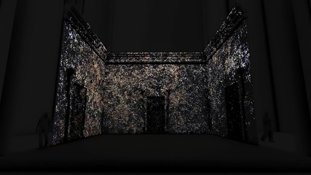 The set in its pure state. The architectural details are projected onto the physical elements to create a very impactful image. You can just make out the boxes housing two of the projectors above the stage.